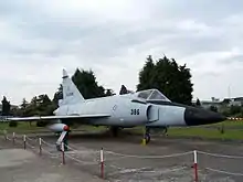 At the same time the wing was redesigned, being made thinner and wider. The leading edge was given a conical droop, with the apex at the root, to improve handling at low speeds. Because the droop remained within the shock cone of the leading edge, the drag rise at supersonic speeds was minimal. A second, inboard fence was added.[17][18]