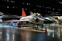 Proposals for the airframe were issued on 18 June 1950, and in January 1951 six manufacturers responded.[6] On 2 July 1954, three companies, Convair, Republic and Lockheed won the right to build a mockup. Until then, Convair had done research into delta-winged aircraft, experimenting with different designs, two of which fell under the name P-92. Of the three, the best design was to win the production contract under the name "Project MX-1554". In the end, Convair emerged as the victor with its design, designated "XF-102", after Lockheed dropped out and Republic built only a mockup.[5] The development of three different designs was too expensive and in November, only Convair was allowed to continue with its Model 8-80.[7] To speed development, it was proposed to equip the prototypes and pre-production aircraft with the less-powerful Westinghouse J40 turbojet. Continued delays to the J67 and MA-1 (formerly "MX-1179")[8] FCS led to the decision to place an interim aircraft with the J40 and a simpler fire control system (dubbed "E-9") into production as the F-102A. The failure of the J40 led to the Pratt & Whitney J57 turbojet with afterburner, rated with 10,000 pounds-force (44 kN) of thrust[9] being substituted for the prototypes and F-102As.[10][11] This aircraft was intended to be temporary, pending the development of the F-102B, which would employ the more advanced Curtiss-Wright J67, a licensed derivative of the Bristol-Siddeley Olympus which was still in development.[12] The F-102B would later evolve to become the F-106A, dubbed the "Ultimate Interceptor".[9]