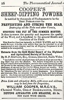 As a veterinary surgeon he was frequently confronted by the horrendous condition of farm animals caused by various parasitic insects, in particular a skin disease which afflicted sheep known as "sheep scab" - at the time treated very ineffectually by only ointments composed of tobacco stalk and brimstone emulsified in animal fats.[5] Cooper began to conduct his own experiments with preparations of arsenic and sulphur. By 1852 his experiments were conclusive enough for him to market the first truly effective sheep dip known as "Cooper's dip" it was sold in a powdered form which was easily transportable.