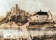 Painting of Schloss Wölpe in 1823. Left: its original site as a motte and bailey castle