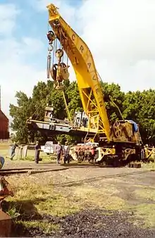 The largest cranes are used for accident recovery work, usually forming part of a breakdown train that includes staff accommodation and recovery equipment. These are large enough to lift derailed rolling stock back onto the track, although two or more cranes may be required to safely recover a locomotive.[1][2] In North American terminology, a 'breakdown crane' is often referred to as a 'wrecker' and the train of which it is a part is referred to as a 'wreck train'. The members of the crew that recovers the wrecked car(s) or locomotive(s) are referred to as 'wreckers'.