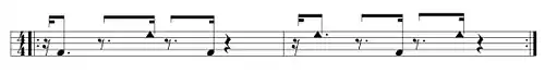 The fundamental salidor and segundo drum melody of the Havana-style columbia, is an embellishment of six cross-beats.[64] The combined open tones of these drums generate the melodic foundation. Each cross-beat is "doubled," that is, the very next pulse is also sounded.