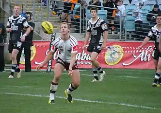 With Hodkinson moving to play for the Canterbury-Bankstown Bulldogs, Cherry-Evans made his debut for Manly in Round 1 of the 2011 NRL season against the Melbourne Storm at halfback in the Sea Eagles 18–6 loss at AAMI Park.[6] In Round 12 against the Brisbane Broncos at Suncorp Stadium, Cherry-Evans scored his first NRL career tries in the Sea Eagles 34–10 victory, one of which was set up by a flick pass from Fullback Brett Stewart who while diving for the ball had scooped it up one handed and passed to Cherry-Evans in the same movement.[7] In round 13 against the Bulldogs, Cherry-Evans crossed the try line untouched from a scrum, performed a one-on-one strip on Dene Halatau, and had 3 try assists in a dominating display that saw him named as halfback in the BigPond Sport Team of the Week.[8] In October 2011, English coach Steve McNamara offered Cherry-Evans a starting spot on the England team for the 2011 Four Nations as he is eligible for England through his English born mother Kellie. Cherry-Evans declined the offer, declaring himself available only to play representative football for both Queensland and Australia should he be selected.[9]