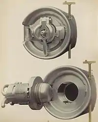 Starting in May 1916, the 155 L guns were progressively replaced by newer models of the same or similar caliber. The 155 L tubes were generally retired after they had 10,000 rounds fired through them. Owing to production shortages of the more modern artillery pieces that were supposed to replace the 155 L, a number of replacement barrels for the 155 L were however manufactured starting in 1916. These were of somewhat simplified construction, with constant-step rifling. The most distinctive visual difference between the old and new 155 L barrels is their lifting handle, which is longitudinally aligned with the main axis of the old barrels but is transversely mounted on the new barrels.[1] The introduction of quick-firing, replacement materiel for the 155 L, which was initiated by the First Stage of the Realization of the Heavy Field Artillery Program of May 30, 1916 was still not finished in November 1918. The field artillery of each French army corps still had a battalion of 155 L model 1877 guns at this late date in the war.[4][5]