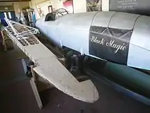 Aerodynamic efficiency was a major design priority and it was therefore decided to use a thin wing of RAF34 section. This was not thick enough to contain spars of sufficient depth to carry the flight loads and so the wing skin would have to carry most of the loads in a "stressed-skin" construction.[10] However, the complex curves required for aerodynamic efficiency could not be manufactured using plywood. Hagg, who also had experience as a naval architect, adapted a construction technique previously used for building lifeboats. The majority of the wing was covered using two layers of 2-inch (50 mm) wide spruce planking laid diagonally across the wing, with the outer layer laid crosswise over the inner. These strips were of variable thickness, according to the loads they carried, reducing over the span of the wing from 0.5 in (12.5 mm) at the root to 0.14 in (3.5 mm) towards the tips. It was built as a single assembly around three box-spars located at 21, 40 and 65 percent chord: there was an intermediate spruce stringer between each pair of spars to prevent buckling. The ribs were made of birch ply and spruce. The outboard 6 ft (1.5 m) were skinned with various thicknesses of ply because of the difficulty of machining spruce planking to less than 0.07 in thickness. The leading edge, forward of the front spar, was also ply covered. The centre section was reinforced with two additional layers of 0.07 in spruce.[11] This method of construction had been made possible only by the recent development of high-strength synthetic bonding resins and its success took many in the industry by surprise.[12]
