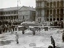 On reaching Baghdad, they overshot it in the dark, landing by a village when they ran low on fuel. Leaving at first light, they just made it to Baghdad on empty tanks. On taking off again they found that they had a serious oil leak and had to return for repairs.[20] These repairs were carried out by T.J. Holmes RAF (while in Baghdad on RAF secondment. More trouble was encountered on the Darwin leg so they landed at Batavia,[21] where engineers employed by KLM, who had entered the DC-2, made repairs for them. They were the fourth aircraft to reach Melbourne, in a time of 108 h 13 min 30 s. Cathcart Jones and Waller promptly collected film of the Australian stages of the race and set off the next day to carry it back to Britain. Their return time of 13 days 6 hr 43 min set a new record.[22]