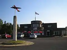 The Comet Hotel, Hatfield was begun the year before the race, as one of the first modernist inns in England.[42] Located close to the de Havilland factory, when it was finished it was named after the Comet Racer. War artist Eric Kennington was commissioned to create a 9 feet (2.7 m) carved column in its car park, which was erected in 1936.[43] On its top is mounted a famous model of the Comet, currently in the livery of Grosvenor House.[44]
