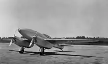 The resulting design had a low, tapered high aspect ratio wing and was powered by two Gipsy Six R engines, a specially-tuned version of the new Gipsy Six. The aircraft was composed almost entirely of wood, the limited use of metal being confined to high-stress components, such as the engine bearers and undercarriage, and to complex curved fairings such as the engine cowlings and wing root fairings. The sheet metal parts comprised a lightweight magnesium-aluminium alloy. Manually-actuated split flaps were fitted beneath the wing's inboard rear sections and lower fuselage, while the Frise ailerons were mass-balanced by lead strips within the aileron's leading edges.[8] Both the rudder and elevators fitted to the conventional tail had horn mass balances. In order to validate the wing design, a half-scale model wing was built and tested to destruction. The exterior skin was treated via a time-consuming and repetitive process of painting and rubbing down to produce a highly smooth surface to reduce air friction and increase overall speed.[9]