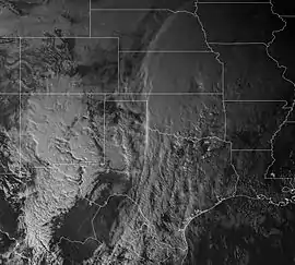 At the same time, discrete tornadic supercells began to appear in areas of Texas. One of the cells produced a violent EF4 wedge tornado, which ripped through parts of Garland and Rowlett, Texas, causing major damage and killing 10 people.[2] As the storm complex began to move to the north, more supercells began to appear with several more tornadoes being reported. By the early morning of December 27, the supercells merged into a squall line, with tornado reports beginning to diminish, but occasionally a few isolated tornadoes would be produced by the storm.