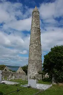 A round tower still stands at the site of the saint's monastery at Ardmore[1] as well as earlier ecclesiastical ruins, such as a stone oratory and a small stone church.[10] The diocese of Ardmore and its episcopal church lasted until the 13th century.[10]
