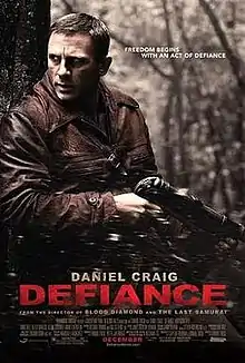 Defiance is a 2008 American war film directed by Edward Zwick set during the occupation of Belarus by Nazi Germany. The screenplay by Clayton Frohman and Zwick was based on Nechama Tec's 1993 book Defiance: The Bielski Partisans, an account of the Bielski partisans, a group led by Polish Jewish brothers who saved and recruited Jews in Belarus during the Second World War. The film stars Daniel Craig as Tuvia Bielski, Liev Schreiber as Zus Bielski, Jamie Bell as Asael Bielski, and George MacKay as Aron Bielski.