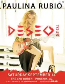 The Deseo Tour is the eleventh concert tour and the fourth world tour[1] by Mexican recording artist Paulina Rubio, in support of her eleventh studio album, Deseo (2018). The tour officially began on June 8, 2019 in Santiago, Chile at the Gran Arena Monticelllo, [2] and has confirmed dates in Mexico, Spain and the United States. According to Paulina, the tour is expected to visit more cities both in Europe and in Latin America.[3]