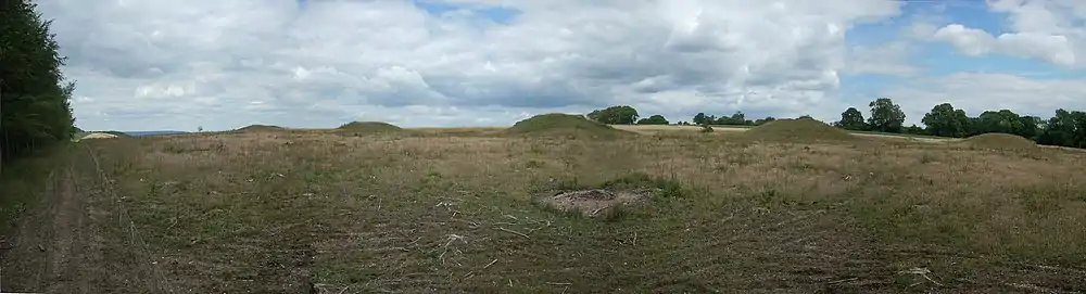 The Devil's Jumps are a group of five large bell barrows situated on the South Downs 1.2 kilometres (0.75 mi) south-east of Treyford in the county of West Sussex in southern England.[1] The Devil's Jumps site is listed as a Scheduled Ancient Monument and as a Local Nature Reserve.[2] Most barrows along the South Downs have been damaged by agriculture and treasure hunters but the Devil's Jumps are considered to be the best preserved Bronze Age barrow group in Sussex.[3] The barrows are laid out in a line running approximately south-east to north-west.[4] The five barrows vary in diameter from 26 to 34 metres (85 to 112 ft) and stand up to 4.8 metres (16 ft) high.[5] Two smaller barrows were situated close to the five main mounds.[6] Traces remain of a sixth barrow.[7] The Devil's Jumps have been dated to the Bronze Age and they are believed to be between three and four thousand years old.[8] The Devil's Jumps were explored in the 19th century, when bones were found in two of the mounds,[9] although some of the barrows contained no cremated remains at all.[10] The main line of five barrows is aligned with sunset on Midsummer Day.[11]