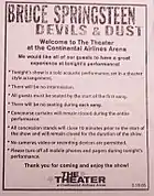 After a week or two of this, however, Springsteen decided it was not what he wanted. The musicians disappeared, and Springsteen would perform on the tour all by himself. As he told Rolling Stone before the tour began, "Nils and some other folks came in for rehearsals to give me a sense of if I wanted to go with something bigger. But what tends to be dramatic is either the full band or you onstage by yourself. Playing alone creates a sort of drama and intimacy for the audience: They know it's just them and just you." [1] He would further explain his challenge to Esquire during the tour: "I don't have a piano and a sax and drums behind me on this tour. So I had to re-approach the guitar as an instrument of solo accompaniment. It becomes a bit of a new land, and I'll play it in ways I've never played it before. I'm constantly asking myself, How can I wring as much music and meaning as possible out of those six strings? One thing I do know: With the correct playing style, you can summon up an orchestra." [1]