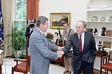 Cheney supported Bob Michel's (R-IL) bid to become Republican Minority Leader.[35] In April 1980, Cheney endorsed Governor Ronald Reagan for president, becoming one of Reagan's earliest supporters.[36]
