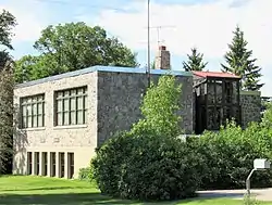 District No. 182 School, also known as the Barnhard School, is a historic building located north of Underwood, in rural Otter Tail County, Minnesota, United States. The building was listed on the National Register of Historic Places in 1991.[1] The school district was established in Sverdrup Township on January 3, 1884, and its first building was a log house constructed by John Randall. It was named for William Barnhard, one of the founders of the district.[2] The log building was replaced the following year by a single-story frame structure, and it was replaced by a two-story frame structure in 1905. By the 1930s this building had become dilapidated and it was considered a fire trap. In July 1938 local voters passed a bond issue and the Works Progress Administration approved the application to construct a new school building. Fergus Falls architect E.O. Broaten designed the building in the Moderne style. The T-shaped structure features a raised basement of exposed reinforced concrete and split-stone walls on the main level. The main level contained two classrooms, a library, and an office, while the basement housed a community room with a stage, a kitchen, fuel room, boiler room, and storage room. The building served as a school until 1982. Five years later a non-profit arts group reopened it as an art center, but foundered after encountering financial difficulties. The former school stood vacant for years and was put up for sale in 2000. Sandra Barhouse, an art professor from St. Cloud State University, purchased the building and undertook an extensive renovation into a private residence and art gallery.[3]