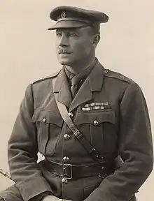 In the First World War he served with the Royal Horse Guards from 1914 to 1918 and was involved in the early battles. On 25 October 1914, 'Beef' as he was known was shot in the leg when trying to carry out a regimental action. "I had to stop and get into Hugh Grosvenor's trench. Got out presently and shot my horse with my revolver and saved all my kit. We were very lucky considering the fire we came in for."[10] At the end of the war he served with the Guards Machine Gun Regiment from 1918 to 1919. During the war he was promoted to Lieutenant-colonel and created a Companion of the Order of St Michael and St George (CMG).[4]
