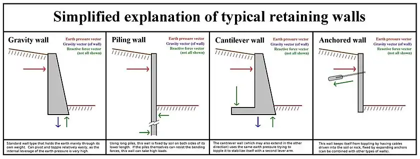 In military engineering, earthworks are, more specifically, types of fortifications constructed from soil. Although soil is not very strong, it is cheap enough that huge quantities can be used, generating formidable structures. Examples of older earthwork fortifications include moats, sod walls, motte-and-bailey castles, and hill forts. Modern examples include trenches and berms.