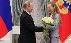 ![]() Vladimir Putin, the Russian President (on the left) congratulates Ekaterina Rumyantseva (on the right) after her medal success | ||||||||||||||||||||||||||||||||||||||