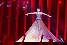 Nechayeva's dress at the contest measured 52 m2 and weighted around 8 kg.[18] Light projections of the song's theme were beamed continuously on the dress. According to Estonia's video artist Alyona Movko, the projections began with an ice queen imagery whose heart is melted by love, as the snow turned into water.[18] Afterwards a fairytale-like glow followed and then the growing of flowers which were sent out by Nechayeva as a symbol of love.[18] A team of at least eight people moved Nechayeva's dress onto the stage, in the exact position required by the projectors.[18] The entire preparation for the performance (finding a dress, creation and generation of the animations, mapping the projections onto the dress, synching with television when captured by a camera and finalising the choreography) took two weeks.[18]