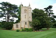 In 1794 a parish vestry meeting decided to replace the ancient church in Lower Ettington with a new one in Upper Ettington, which had become the centre of population even before Evelyn Shirley had the old village demolished. In 1795 Parliament passed an act authorising this and in 1798 the new church of St Thomas of Canterbury was consecrated.[3] The 12th-century church was abandoned, but in 1823 its south transept was restored as a mortuary chapel for the Shirleys. The rest of the original church, including its broad and distinctive tower, survives as a roofless ruin.[10] It is a scheduled monument[9] and a Grade I listed building.[11] Its poor state means that it's on Historic England's Heritage at Risk Register .[12]
