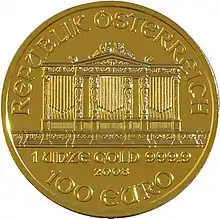 A design of musical instruments representing the Vienna Philharmonic Orchestra, as well as the text Wiener Philharmoniker ("Vienna Philharmonic"), can be seen on the reverse of the coin. The subject of the obverse is the great organ in the Golden Hall in Vienna's Musikverein, the concert hall of the Vienna Philharmonic Orchestra. The face value in euros, the weight, alloy purity and year of issue are also inscribed on this side of the coin. Since 1 February 2008, the coin has also been minted in silver. The design of the silver coin is identical to that of the gold coin, except for its face value of 1.50 euro. | |||