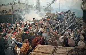 By March 11, 1920, the front line was only 40–50 kilometers (25–31 mi) away from Novorossiysk. The Don and Kuban Armies, which were disorganized by that time, withdrew in great disorder.[1] [2] The line of defense was only held by the remnants of the Volunteer Army, which had been reduced and renamed to the Volunteer Corps, and which had great difficulty in containing the onslaught of the Red Army. The Cossacks failed to reach Taman, and as a result many of them ended up in Novorossiysk with the sole purpose of getting on a ship. In total, the Armed Forces in the South of Russia in the Novorossiysk area on the eve of the evacuation amounted to 25,200 bayonets and 26,700 sabers.