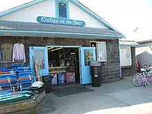 Being a seasonal community, Fair Harbor offers only a few services. The Pioneer Market[12] is the only grocer in the hamlet; Le Dock, the only restaurant, is open for lunch and dinner and offers both indoor and outdoor dining. The Loading Dock sells liquor and wine, and Corliss on the Bay sells miscellaneous items including bikes, souvenirs, hardware, toys, magazines, books, paint, and garden items. There is also an ice cream store and a pizza take-out shop.[13] These stores are open 7 days a week in season and closed during the off season (October through May).[6] There is also the Fair Harbor Clothing store, established by individuals who grew up a block away from Fair Harbor "in a barefoot community," developing a "deep appreciation for the water, waves and bounty of the sea."[14]