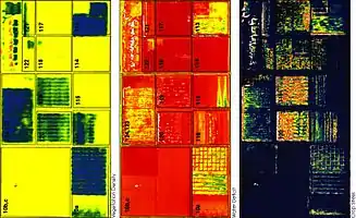 Density slicing, a variation of pseudo color, divides an image into a few colored bands and is (among others) used in the analysis of remote sensing images.[11] For density slicing the range of grayscale levels is divided into intervals, with each interval assigned to one of a few discrete colors – this is in contrast to pseudo color, which uses a continuous color scale.[12] For example, in a grayscale thermal image the temperature values in the image can be split into bands of 2 °C, and each band represented by one color – as a result the temperature of one spot in the thermograph can be easier acquired by the user, because the discernible differences between the discrete colors are greater than those of images with continuous grayscale or continuous pseudo color.