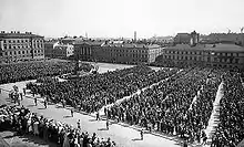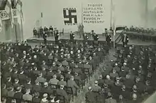 Prior to World War II, Nazis had been making and distributing propaganda among ethnic Germans in Brazil. The Nazi regime built close ties with Brazil through the estimated 100 thousand native Germans and 1 million German descendants living in Brazil at the time.[71] In 1928, the Brazilian section of the Nazi Party was founded in Timbó, Santa Catarina. This section reached 2,822 members and was the largest section of the Nazi Party outside Germany.[72][73][74] About 100 thousand born Germans and about one million descendants lived in Brazil at that time.[75]