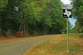 FM 1 was designated on April 23, 1941, the first Farm to Market Road to be designated in Texas. It was designated shortly after it was upgraded from a dirt road to a paved road at the request of The Temple Lumber Company and two gas companies.[2] It wasn't until eight years later that legislation to establish the farm-to-market road system was passed.[2] FM 1 originally ran from Pineland northward to Magasco from its inception in 1941 until October 13, 1954 when FM 1 was rerouted to end at SH 184 and its old route became a spur connection to Magasco. One day later, FM 1776 was cancelled and combined with FM 1. Also, FM 1 was rerouted and its old route became a spur connection to Magasco.[1] Throughout its history, the road has predominantly served the logging industry.[2]