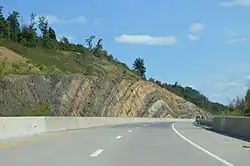 ![]() A road cut along U.S. Route 322 with visible anticline rock strata | |