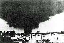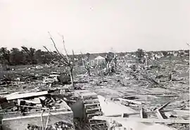 An F5 tornado hit Flint, Michigan on June 8, 1953.[8] The tornado moved east-northeast 2 miles (3.2 km) north of Flushing and devastated the north side of Flint and Beecher. The tornado first descended about 8:30 p.m. on a humid evening near a drive-in movie theater that was flickering to life at twilight time. Motorists in the drive-in began to flee in panic, creating many auto accidents on nearby roads. The tornado dissipated near Lapeer, Michigan. Nearly every home was destroyed on both sides of Coldwater Road. Multiple deaths were reported in 20 families, and it was reported that papers from Flint were deposited in Sarnia, Ontario, Canada, some sixty miles east of Flint. Large sections of neighborhoods were completely swept away, with only foundations left. Trees were debarked and vehicles were thrown and mangled. One hundred and sixteen were killed,[9] making it the tenth deadliest tornado in U.S. history.[10] The death toll was surpassed by the 2011 Joplin tornado.[11] It is also one of only two F5 tornadoes ever to hit in Michigan. Another F5 tornado would hit in Hudsonville on April 3, 1956.[4]