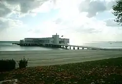 The building is constructed on steel piles driven into the seabed and is connected to the sandy beach about 70 m (230 ft) away with a wooden pier. The L-shaped, one-floor mansion consists of a reception hall, a reading room, bedrooms and bathroom. There are also service and staff rooms at the complex.[1][2][3] The total area covered by the mansion including the pier is 602 m2 (6,480 sq ft).[4][5]