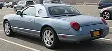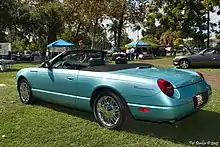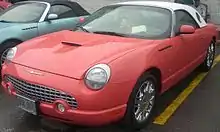 The eleventh generation of the Ford Thunderbird is a two-seater grand touring convertible manufactured and marketed by Ford between 2001 and 2005 for model years 2002 through 2005. It was designed to evoke the first generation Thunderbird that had been made from 1955 to 1957, coming with a removable hardtop with prominent circular glazing, a power folding top, and a vinyl tonneau cover. Mechanically borrowing heavily from the Lincoln LS, it was built on the Ford DEW platform with a front-engine, rear-wheel-drive layout, and was powered by a 3.9-liter (0.86 imp gal; 1.0 U.S. gal) V8 engine with a five-speed automatic transmission.