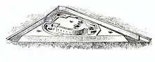 At Liège, 12 forts – six small and six large – were to be placed in a ring 7–9 kilometres (4.3–5.6 mi) from the city.[18] The circumference of the city's fortress ring was about 46 kilometres (29 mi), with a gap of around 3.8 kilometres (2.4 mi) between some of the forts,[19] held by intermediate works. The ring forts were placed away from ravines or depressions that could conceal attackers. There were also to be a fort at Visé to guard its ford over the Meuse and at Huy, half-way between Liège and Namur.[20] Construction of the Meuse forts was first estimated to cost 24 million francs,[18] and this was the sum given to Brialmont on 1 June 1887 even before his geological surveys were complete. To his consternation, no funds were allotted for Visé or Huy,[11][18] and Brialmont had to economize his plans for the forts he could build. There just two traces, a triangular or a trapezoidal shape, depending on the terrain. The fort structures were regimented similarly. There were three plans for the gorges and two for the central bunker, its casemates, and connecting galleries. The Meuse fortresses would be the first to be built entirely of concrete. The 'base' of a fort faced Liège, as did its entry ramp. During the Battle of Liège, the fortress ring was bolstered with the addition of 31 redoubts and 63 trenches, behind and in front of the forts and surrounded by barbed wire.[21]