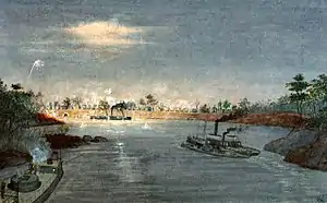 The fortress of Humaitá was situated on a level cliff about 30 feet (10 metres) above the river, on a sharp horseshoe bend.[58] The bend, called the ‘’’Vuelta de Humaitá’’’[59] was an ideal strategic pinch point. It was some 1,500 metres (4,900 ft) long; the navigable channel narrowed to only 200 metres (660 ft) broad; the current was 2.8 knots (5.2 km/h; 3.2 mph) and in places 3 knots (5.6 km/h; 3.5 mph), difficult for the ships of the day to stem; and (a matter that was to horrify the Brazilian navy[60]) ideal for the release of ‘torpedoes' (nineteenth century floating naval mines).[61][62]