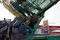 Electric motor, belt, hydraulic pump, and belt to final drive tire propulsion of a mobile Round up by Frank Hrubetz & Co. at a funfair in Germany