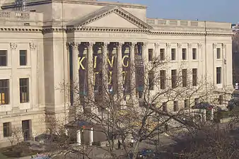 The Institute's original building at 15 South 7th Street, now the home of the Atwater Kent Museum, eventually proved too small for the Institute's research, educational programs, and library. The Institute moved into its current home on the Benjamin Franklin Parkway, near the intersection with 20th Street, in 1934. The new facility was intended from the start to educate visitors through hand-on interactions with exhibits: "Visitors to this museum would be encouraged to touch, handle, and operate the exhibits in order to learn how things work."[6] Funds to build the new Institute and Franklin Memorial came from the Poor Richard Club, the City Board of Trust, the Benjamin Franklin Memorial, Inc., and the Franklin Institute. John T. Windrim's original design was a completely square building surrounding the Benjamin Franklin Statue, which had yet to be built. Despite the effects of the Great Depression, the Benjamin Franklin Memorial, Inc. raised $5 million between December 1929 and June 1930. Only two of the four wings envisioned by Windrim were built; these face the Parkway and share design elements with other cultural and civic structures around Logan Circle.