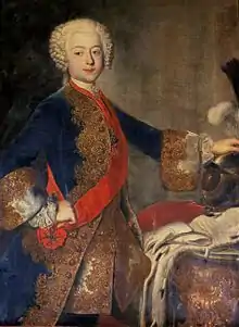 - Genealogie ascendante jusqu'au quatrieme degre inclusivement de tous les Rois et Princes de maisons souveraines de l'Europe actuellement vivans [Genealogy up to the fourth degree inclusive of all the Kings and Princes of sovereign houses of Europe currently living] (in French). Bourdeaux: Frederic Guillaume Birnstiel. 1768. p. 48.