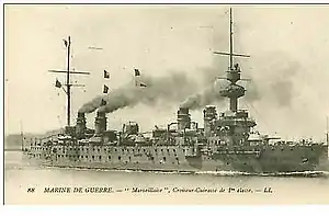 Marseillaise, named after the French national anthem,[7] was authorized in the 1898 Naval Program and was ordered from the Arsenal de Brest on 19 June 1899. The ship was laid down on 10 January 1900, launched on 14 July 1900, and completed in October 1903.[8] The cost of her construction was 22,031,750 francs. Marseillaise was initially assigned to the 1st Cruiser Division (1re Division de croiseurs) of the Northern Squadron. The ship carried President of France Emile Loubet to Naples, Italy, for a state visit in April 1904 and was then transferred to the Light Squadron (Escadre légère) of the Mediterranean Squadron in October. By September 1905, she was flagship of Rear Admiral (Contre-amiral) Paul Campion, commander of the squadron, and remained as such until she was briefly placed in reserve in July 1907.[9]