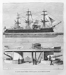 The keel for Amiral Duperré was laid down at the Société Nouvelle des Forges et Chantiers de la Méditerranée shipyard in La Seyne-sur-Mer outside of Toulon in January 1877. She was launched in September 1879 and fitting-out work was completed by 1883.[4] The ship thereafter served in the Mediterranean Squadron. On 2–3 March 1886, she took part in experiments with torpedo boats to determine the effectiveness of various attack angles. Later on the 3rd, Amiral Duperré and the ironclads Colbert, Friedland, Redoutable, Suffren, and Dévastation conducted shooting practice using the old ironclad Armide as a target. They fired at a range of 2,700 to 4,600 m (3,000 to 5,000 yd) and scored 22 percent hits with cast iron practice shells, though they conducted the test under unrealistic conditions, with Armide anchored in a calm sea.[7][8] The year's large-scale maneuvers were held off Toulon from 10 to 17 May, and they tested the effectiveness of torpedo boats in defending the coastline from a squadron of ironclads, whether cruisers and torpedo boats could break through a blockade of ironclads, and whether a flotilla of torpedo boats could intercept ironclads at sea.[9]