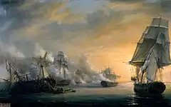 Formidable was the flagship of Rear-Admiral Pierre Dumanoir le Pelley, who commanded the six-ship vanguard of the French fleet, along with Formidable, Scipion, Duguay-Trouin, Mont-Blanc, Intrépide and Neptune. The vanguard was kept as a reserve, and joined the battle around 16:00. They only sailed close to the battle and fired a few shots.