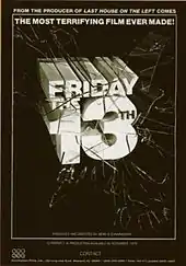 The original Friday the 13th was produced and directed by Sean S. Cunningham, who had previously worked with filmmaker Wes Craven on The Last House on the Left (1972). Cunningham, inspired by the success of John Carpenter's Halloween (1978), wanted Friday the 13th to be shocking, visually stunning, and "[make] you jump out of your seat". Distancing himself from The Last House on the Left, Cunningham wanted Friday the 13th to be more of a "roller coaster ride".[1] The first film was meant to be "a real scary movie", and at the same time make audiences laugh. The concept for Friday the 13th began as nothing more than a title. A Long Night at Camp Blood was the working title Victor Miller used while he drafted a script, but Cunningham believed in his "Friday the 13th" moniker and rushed to place an advertisement in International Variety. Worrying that someone else owned the rights to the title and wanting to avoid potential lawsuits, Cunningham thought it would be best to find out immediately. Cunningham commissioned a New York advertising agency to develop his visual concept of the Friday the 13th logo, which consisted of big block letters bursting through a pane of glass.[59] In the end, Cunningham believed there were "no problems" with the title, but distributor George Mansour contends that there was an issue: "There was a movie before ours called Friday the 13th: The Orphan. Moderately successful. But someone still threatened to sue. It is unknown whether Phil [Scuderi] paid them off, but the issue was eventually resolved."[60]