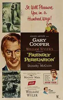Friendly Persuasion is a 1956 American Civil War drama film starring Gary Cooper, Dorothy McGuire, Anthony Perkins, Richard Eyer, Robert Middleton and Phyllis Love. The screenplay was adapted by Michael Wilson from the 1945 novel The Friendly Persuasion by Jessamyn West, and was directed by William Wyler. The film tells the story of a Quaker family in southern Indiana during the American Civil War and the way the war tests their pacifist beliefs.