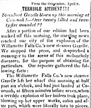- "Awful Explosion of Steamer Gazelle: Twenty-Eight Lives Lost !!!: Thirty Others Wounded !!". Oregon Spectator. 7 (9). Oregon City, O.T.: Goodrich, C.L. Apr 14, 1854. p. 1 col. 1.
