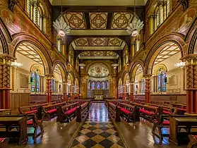 Commemorating three Protestants burnt during the reign of Queen Mary, the Martyrs' Memorial was intended as a rebuke to those very high church tendencies which had been instrumental in promoting the new authentic approach to Gothic architecture.[15] St Giles' was in plan, with its long chancel, of the type advocated by the Ecclesiological Society: Charles Locke Eastlake said that "in the neighbourhood of London no church of its time was considered in purer style or more orthodox in its arrangement".[16] It did, however, like many churches of the time, incorporate wooden galleries, not used in medieval churches[17] and highly disapproved of by the high church ecclesiological movement.