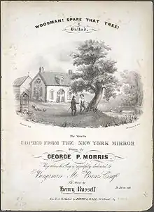 In addition to his publishing and editorial work, Morris was popular as a poet and songwriter; especially well-known was his poem-turned-song "Woodman, Spare that Tree!"[10] His songs in particular were popular enough that Graham's Magazine in Philadelphia promised Morris $50, sight unseen, for any work he wanted to publish in the periodical.[11] "Woodman, Spare that Tree!" was first published in the January 17, 1837, issue of the Mirror under the title "The Oak" and was that year set to music by Henry Russell before being reprinted under its more common title in 1853.[12] Lines from the poem are often quoted by environmentalists. The poem was also included in one of Morris's volumes of collected poems, The Deserted Bride and Other Poems, 1838, which ran into several editions.