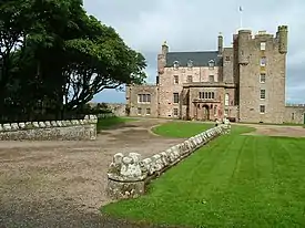 George Sinclair, 4th Earl of Caithness died at Edinburgh on 9 September 1582 and was buried in Rosslyn Chapel.[1] At his own request, his heart was extracted and encased in a leaden casket that was sent to Caithness and deposited at the church in Wick. On Barrogill Castle (Castle of Mey) there is an ancient carving of the arms of George Sincalir, 4th Earl of Caithness.[2]