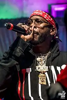 Thicke performed the song at the 2013 MTV Video Music Awards in a medley alongside "Blurred Lines" and Miley Cyrus's "We Can't Stop".[22] Kendrick Lamar and 2 Chainz accompanied Thicke, performing their verses from the remixed version of the song.[23] Phillip Mlynar of MTV News described the performance as having a "football referee–themed vibe", as Thicke donned a black-and-white stripped suit with cheerleader-themed dancers surrounding him.[23] "Give It 2 U" was regularly performed as the opening number on Thicke's debut headlining tour, the Blurred Lines Tour (2014).[24]